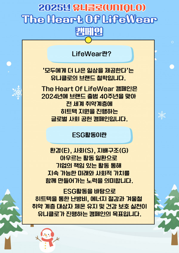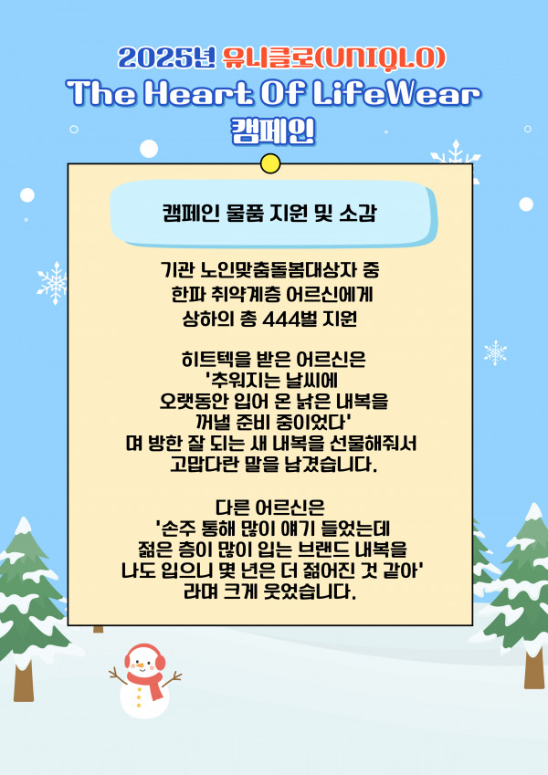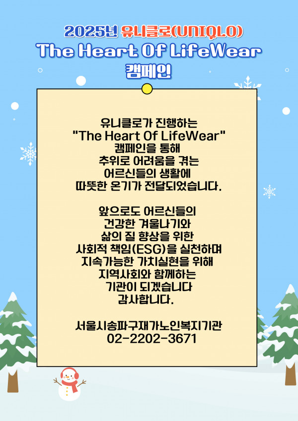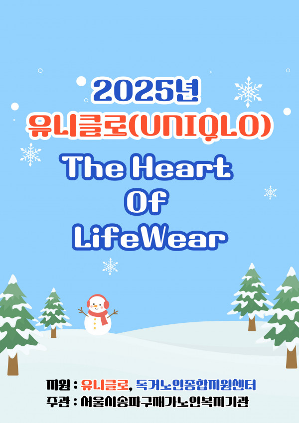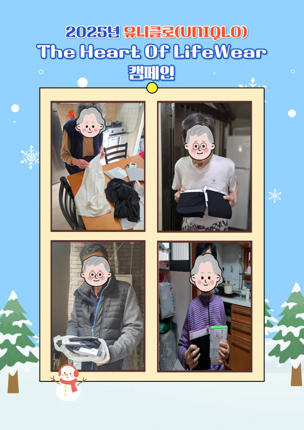 ■ 일시 : 11. 13.(금)■ 지원 : 유니클로, 독거노인종합지원센터안녕하세요. 서울시송파구재가노인복지기관입니다. 2025년 유니클로(UNIQLO) "The Heart Of LifeWear" 캠페인이 진행되었습니다.