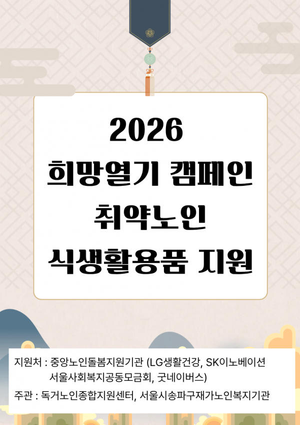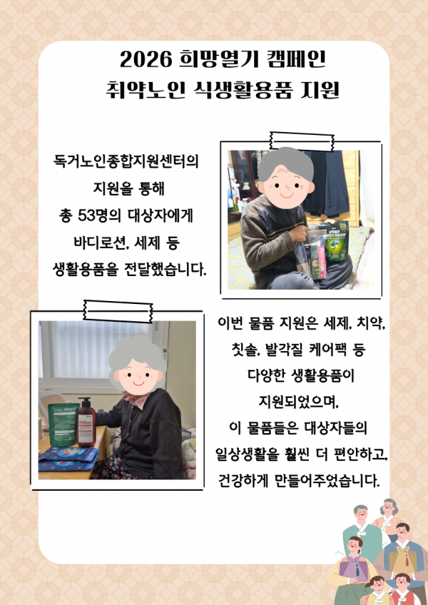 안녕하세요. 서울시송파구재가노인복지기관입니다. 2026년 희망열기 캠페인을 통해 53명의 취약노인에게 식생활용품 지원이 진행되었습니다.