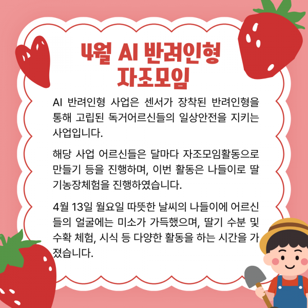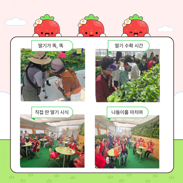 노인맞춤돌봄사업 AI 사업 참여 대상자 어르신들 함께 딸기농장 체험 활동을 다녀왔습니다.