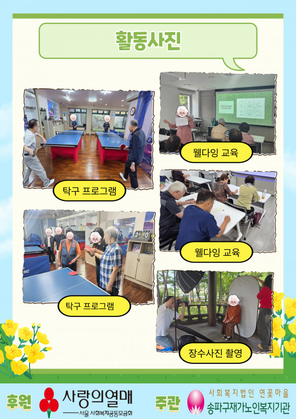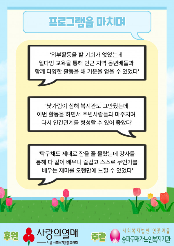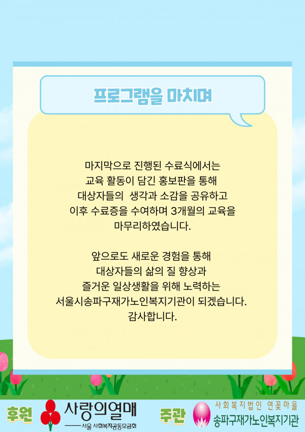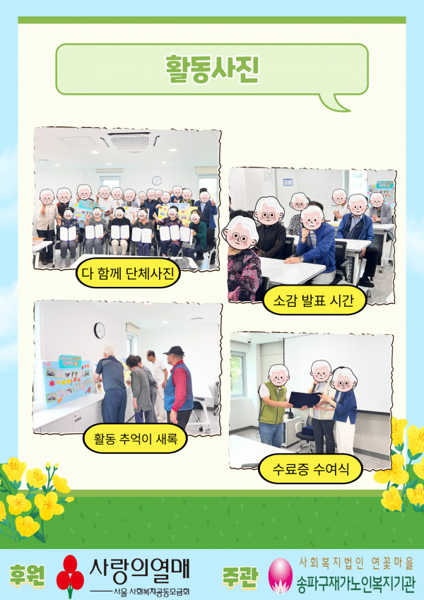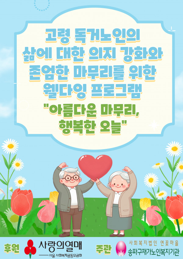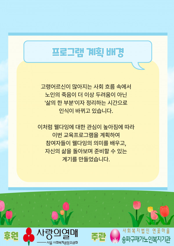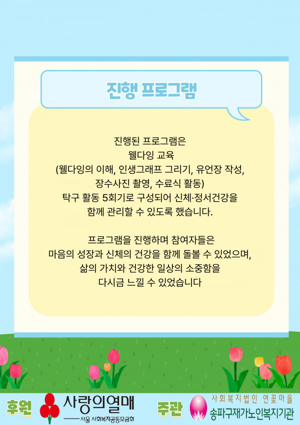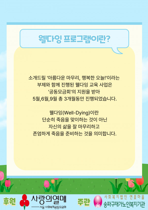 ■ 일시 : 2025. 5 ~ 2025. 9■ 후원 : 사랑의 열매,서울 사회복지공동모금안녕하세요. 서울시송파구재가노인복지기관입니다.2025년 사랑의 열매 송파나눔네트워크의 지원사업을 받아 웰다잉 교육을 진행했습니다.