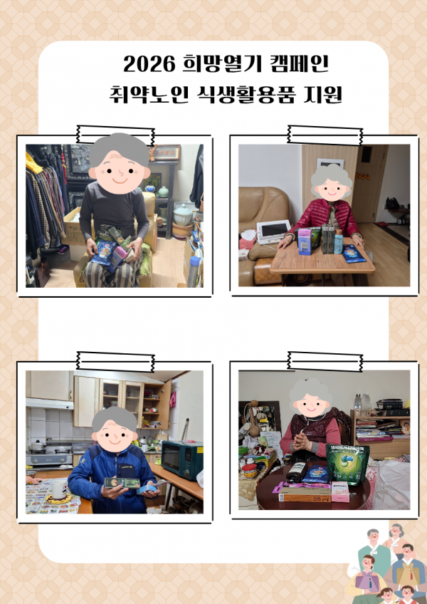 안녕하세요. 서울시송파구재가노인복지기관입니다. 2026년 희망열기 캠페인을 통해 53명의 취약노인에게 식생활용품 지원이 진행되었습니다.